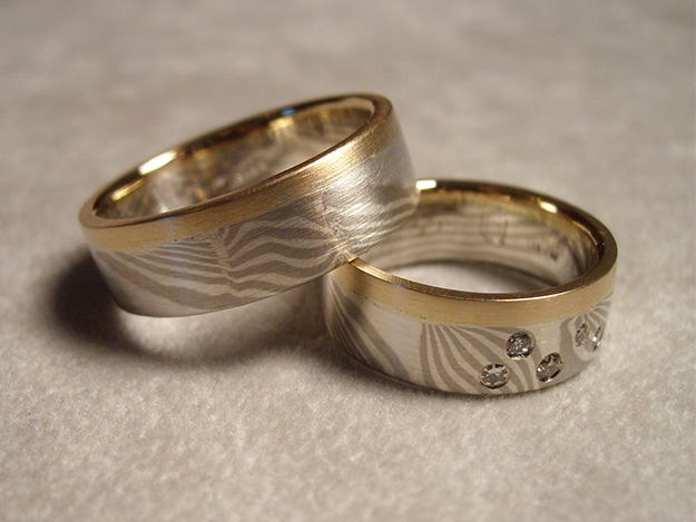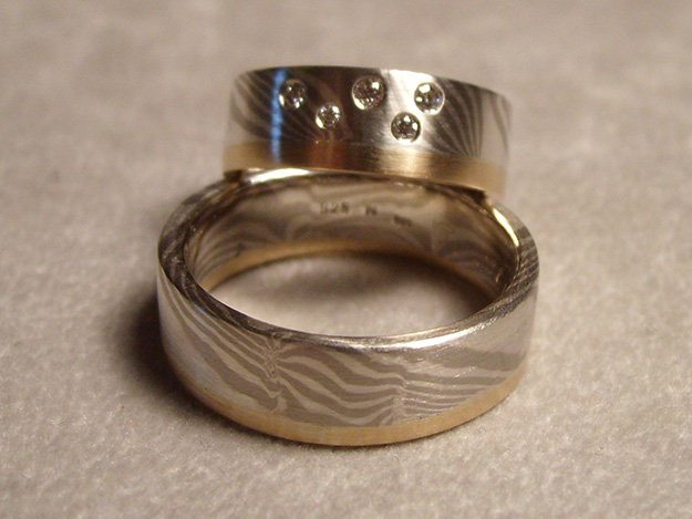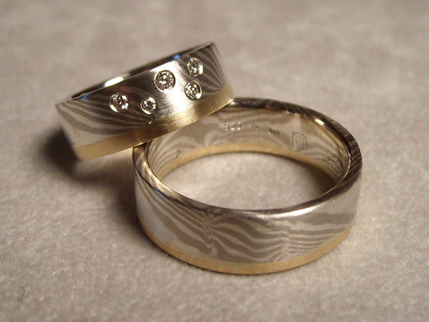 Trauringe in Mokume Gane, 935/000 Silber und 500/000 Palldium. Ergänzt mit 585/000 Roségoldring. Damenring mit Brillanten.