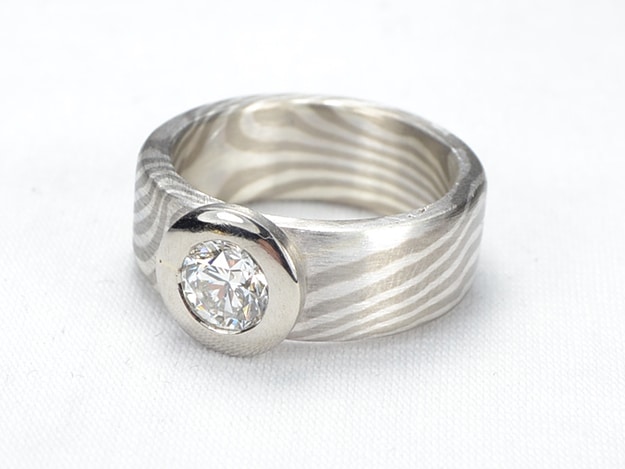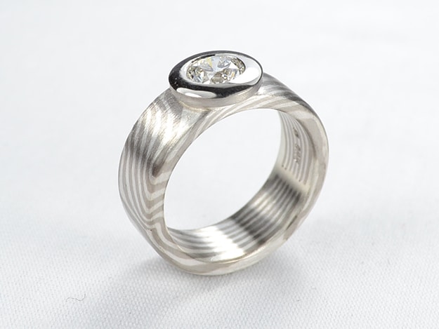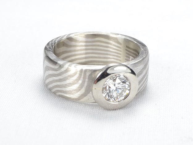 Mokume Gane, 500/000 Palladium und 925/000 Silber, mit Palladiumfassung für kundeneigenen Brillant.