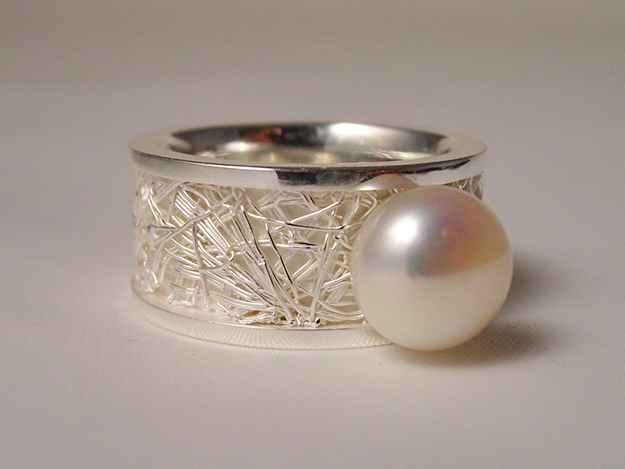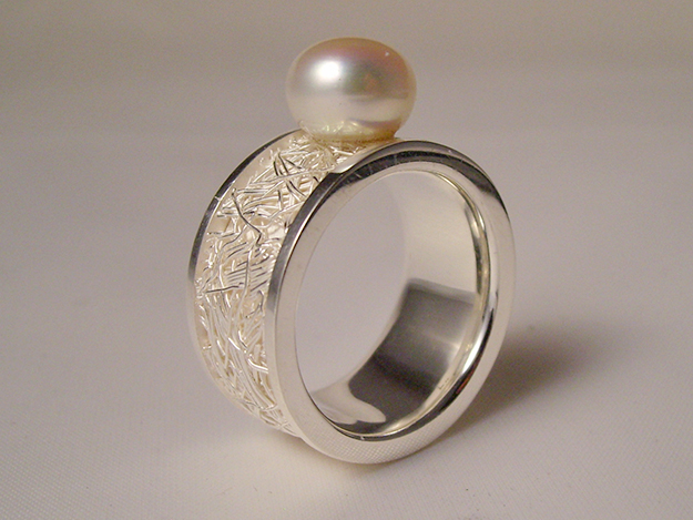 Breiter Silberring mit aufgelegter Fasermatte, Bouton-Süßwasserzuchtperle.