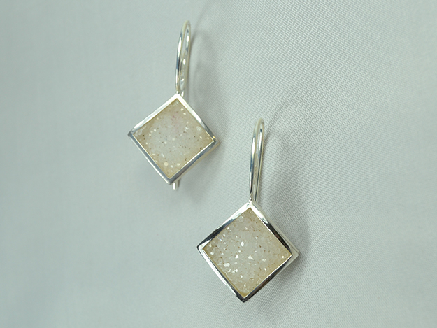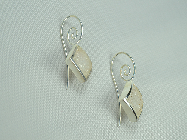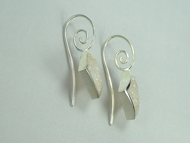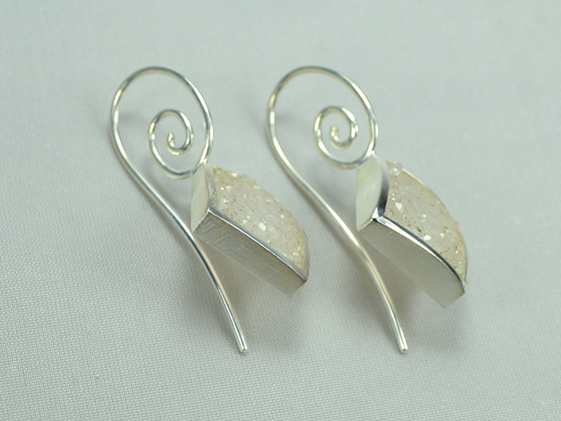 Kristallisierter, weißer Achat in 925/000 Silber Fassung an doppelt geschwungenem Schweizer Haken, ca. 30mm Länge.