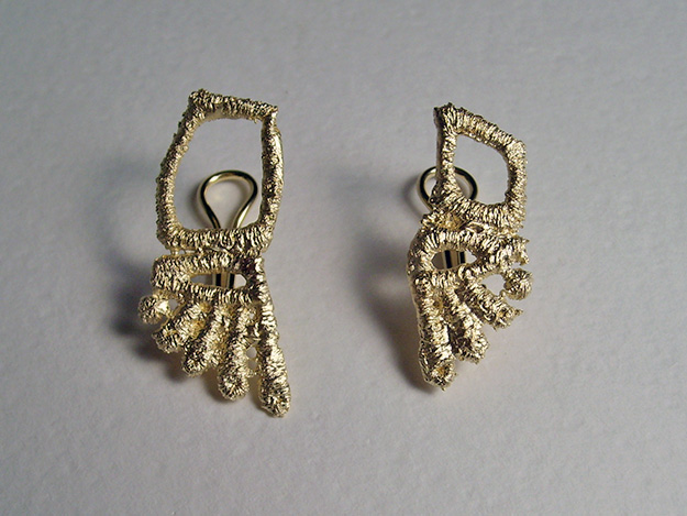 Spitze in Silber/goldplattiert abgegossen, mit Garnstruktur, als Clip mit Stecker zum besseren Sitz am Ohr, 12x29mm