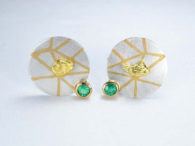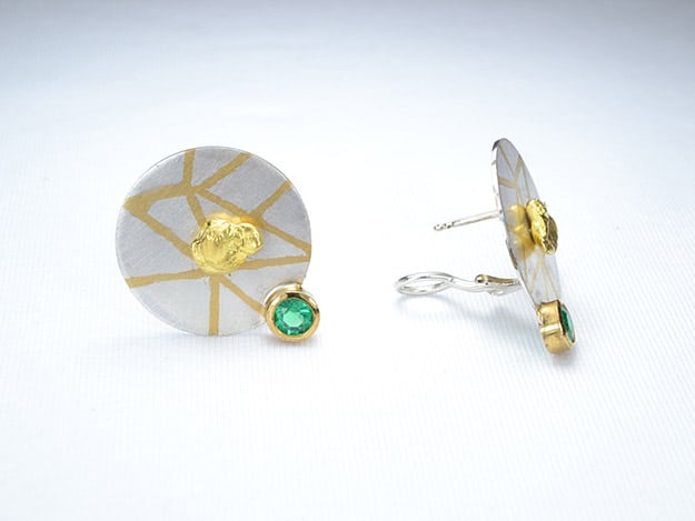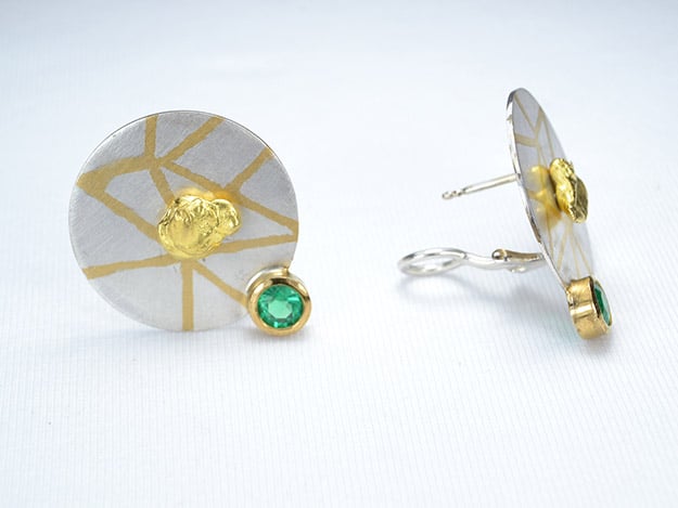 Mit Teilvergoldung auf die Silberplatte aufgebrachte Linien, mittig Rheingold 940/000 und am Rand Zargenfassungen für rekonstruierte Smaragde. Rekonstruierte Edelsteine werden aus Originalmaterial unter hohem Druck und mit hohen Temperaturen geschaffen. Das aus jahrtausenealtem Material ne geschaffene Kristall wird dann in einzelne Edelsteine geschliffen.