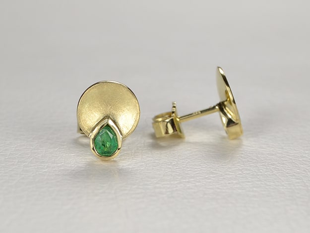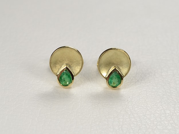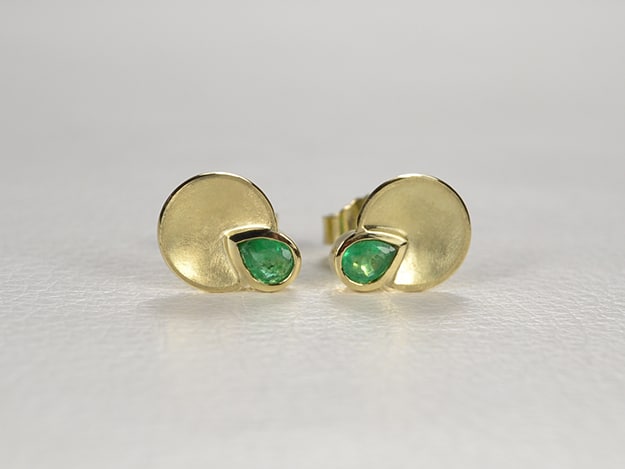 Aufgetiefte Teller mit Zargenfassungen für facettierte Smaragdtropfen.