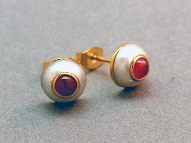 Halbe Akoyazuchtperle mit 750/000 Gelbgoldfassung für Rubincabochons, Durchmesser 9mm.