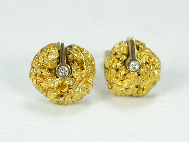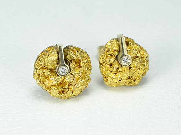 Gold aus dem Rhein 922/000-927/000 Feingehalt, dünn ausgewalzt und geknittert, kombiniert mit 585er Gelbgold, 2 kleine Brillanten, Durchmesser 10mm.