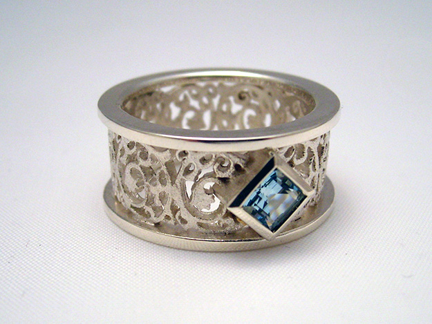 Silberring mit ausgesägtem Muster und angesetzten glatten Seiten, mittig Fassung für Aquamarin-Carrée.