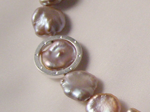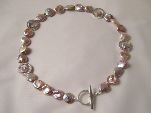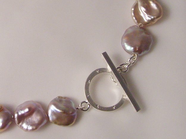 Pflaumenfarbene Süßwasserzuchtperlenkette, mit Zwischenteilen und Schließe in Silber.
