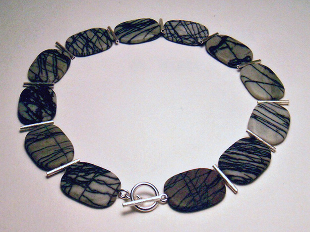 Große, graue Jaspisscheiben mit Streifen, Zwischenteile und Schließe in Silber.