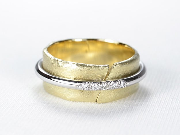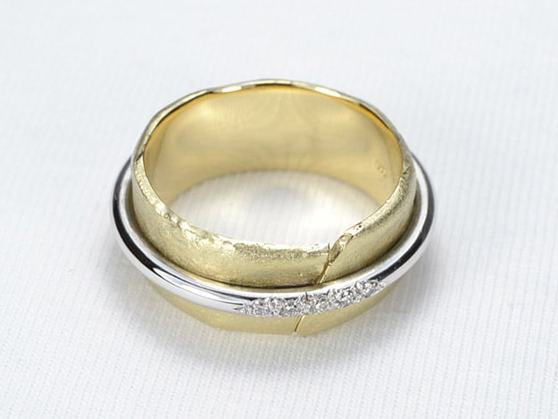Frei geformter, überschmolzener Ring mit glattem Runddrahtring aus Weißgold für die Aufnahme der Brillanten.