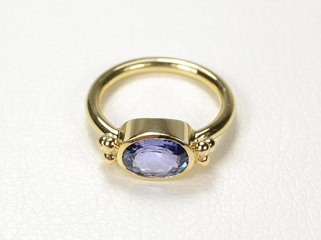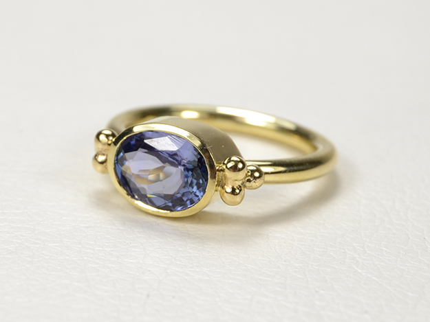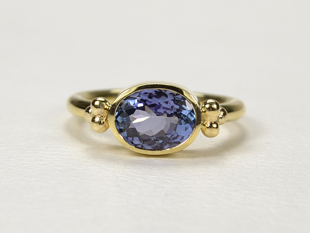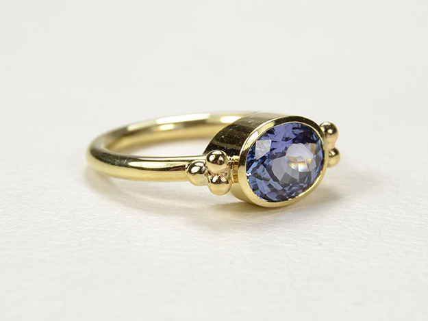 Ring mit Runddrahtschiene, 585/000 Gelbgold, an großer Zargenfassung für einen facettierten Tansanit, beidseitig 3 Kügelchen angesetzt.