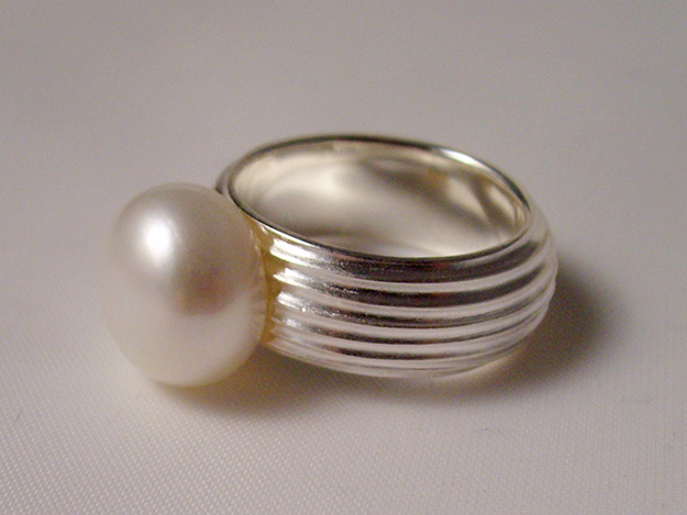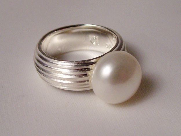Rillenring in Silber mit großer Süßwasserzuchtperle.