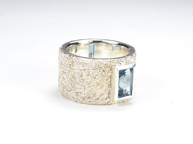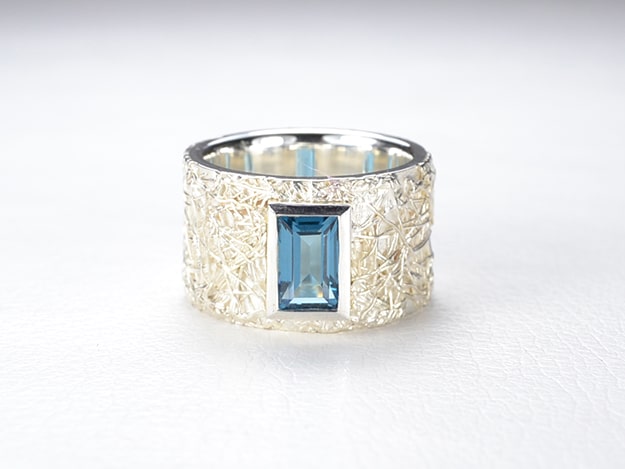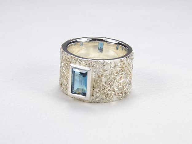 Breiter, flacher Ring mit Fasermatte belötet, beides 925/000 Silber, mit Fassung für rechteckigen Topas.