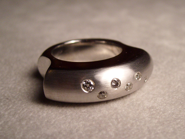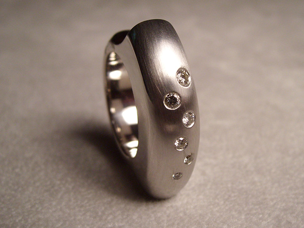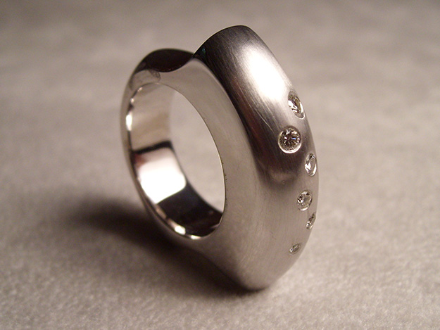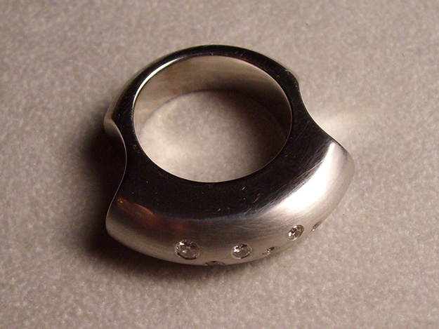 Auf beide Nachbarfinger übergreifender Ring in rhodiniertem Silber, Brillanten glatt eingefasst.
