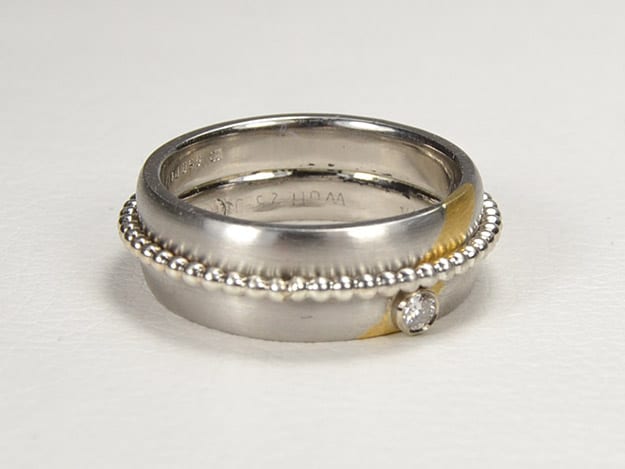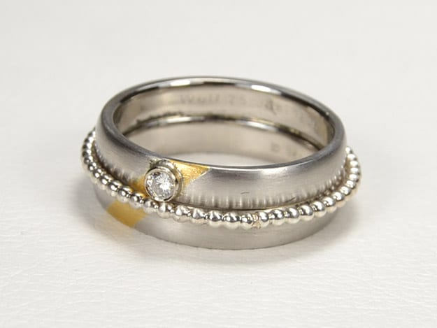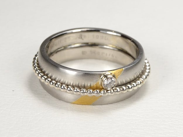 Zwei Platinringe mit Feingoldeinlage wurden zu einem Ring zusammengesetzt, der Übergang der beiden Ringe ist mit einem beweglichen, drehbaren Perldrahtring besetzt.