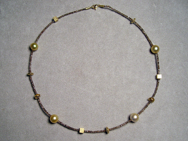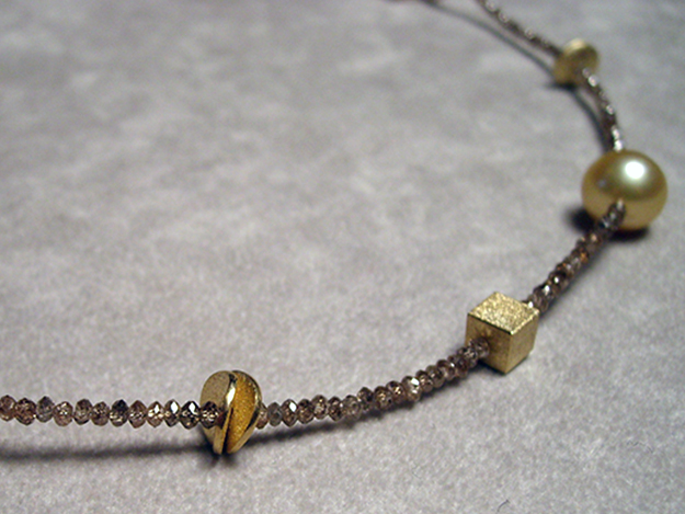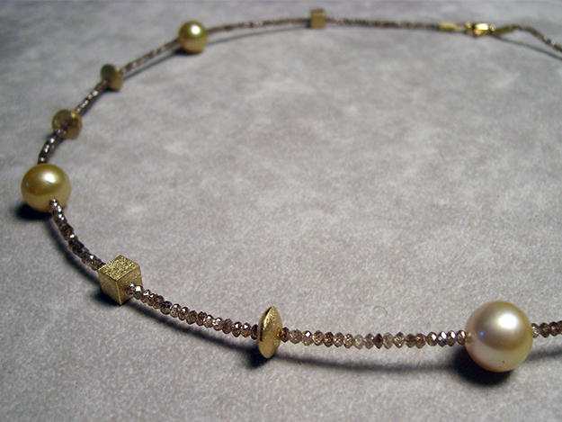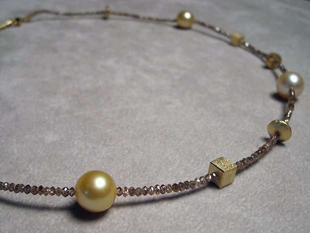 Bräunliche Rohdiamantkette mit Südsee-Perlen und Gold