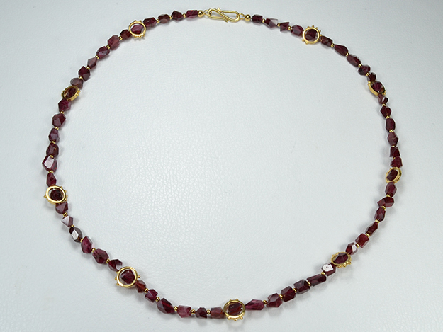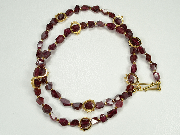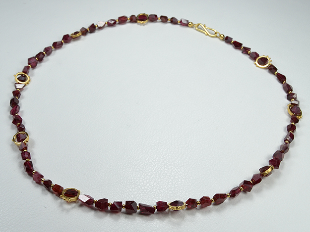 Roter Spinell in Phantasieformen facettiert mit Zwischenteilen in Silber, feingoldplattiert.