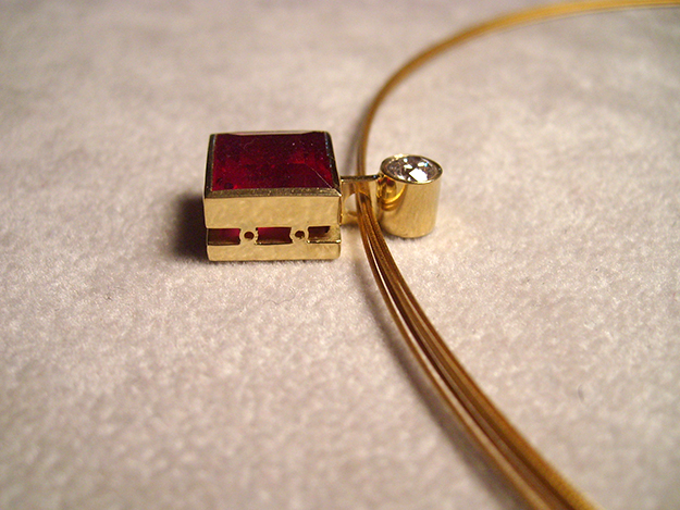Anhänger für dreireihigen Halsreif in 585/000 Gelbgold, mit Rubincarré und Brillant.