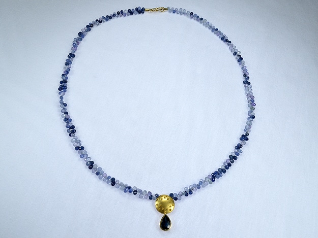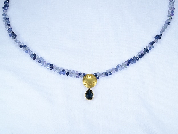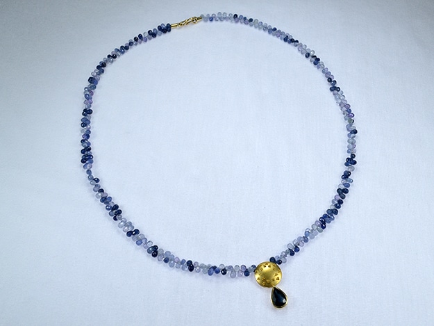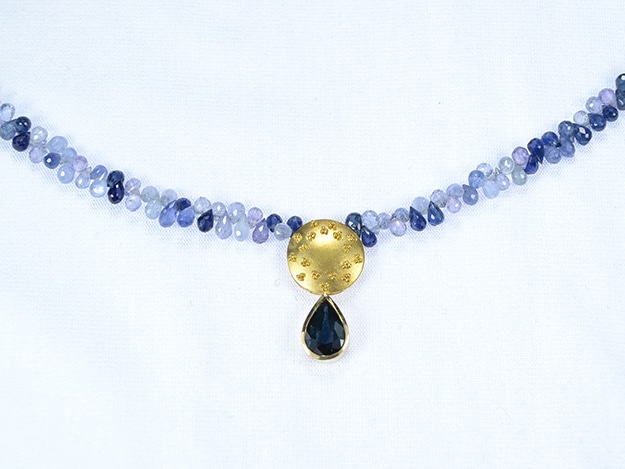 Viele kleine, facettierte Safirpampeln bilden die Kette, deren Mittelteil aus einer granulierten, gewölbten Scheibe mit einem Safirtropfen bildet. Das Granulationsgold besteht aus 900/000 Gelbgold.