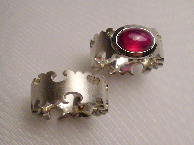 An den Rändern verschnörkelt gearbeiteter Ring mit Zargenfassung für großes Rubin-Cabochon.