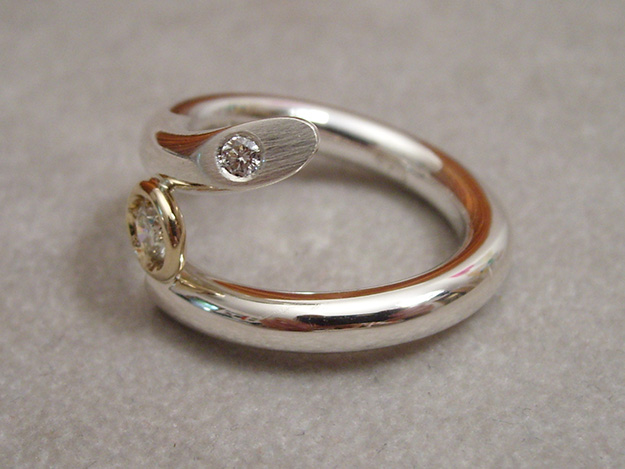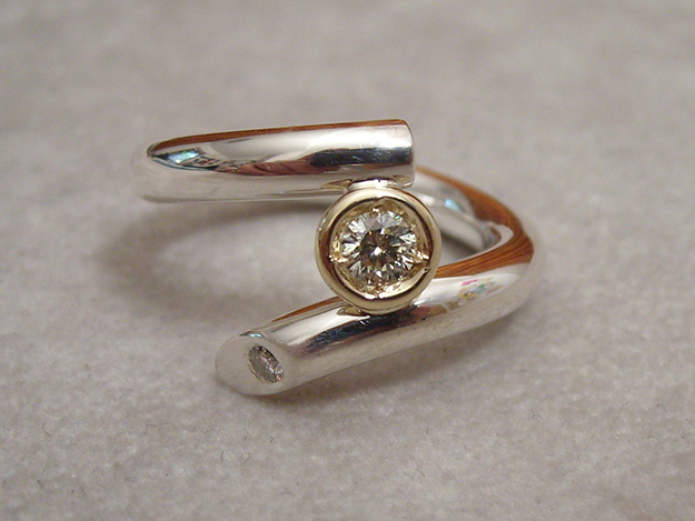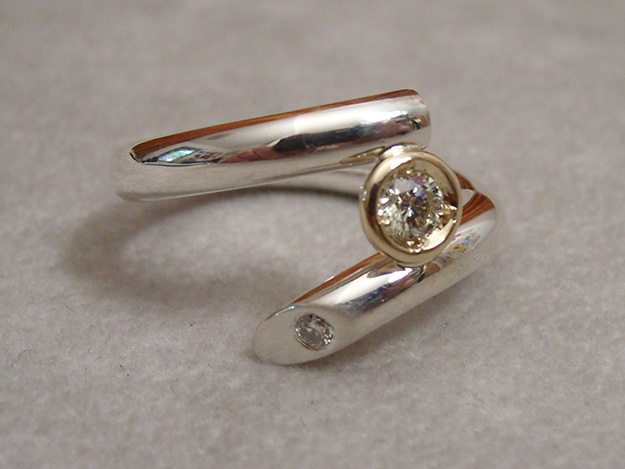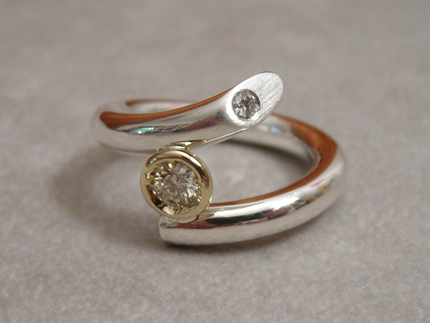Geschwungen gearbeiteter Silberring, 4mm dick, mit aufgesetzter Fassung in Gelbgold für Kundenstein.