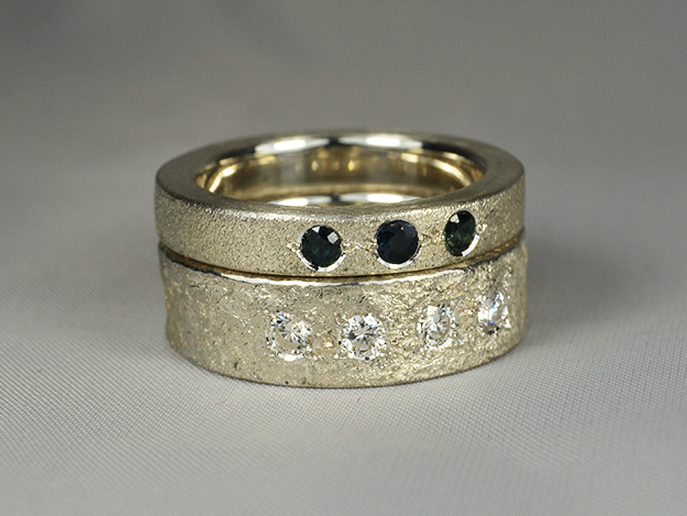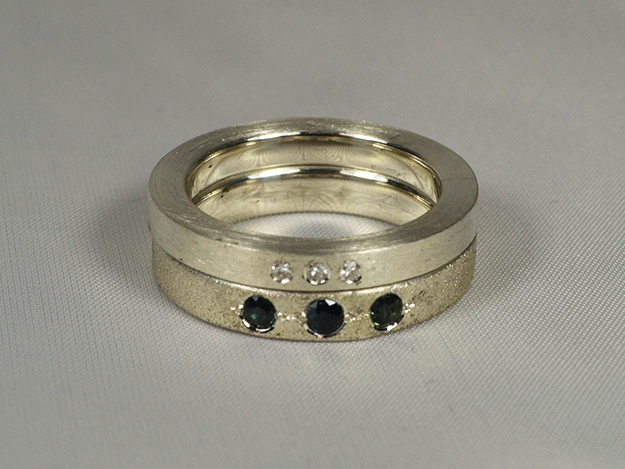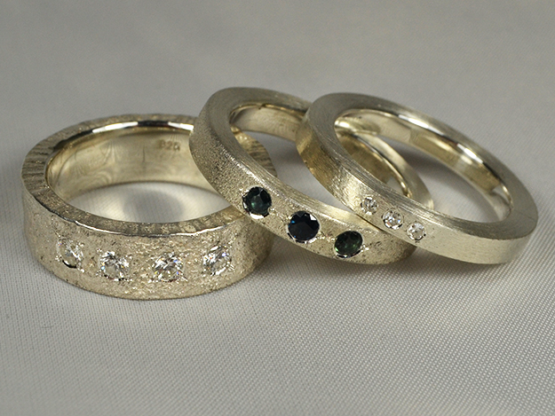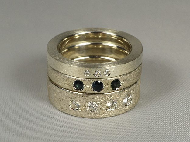 Kundeneigene „Reststeine“ in drei verschieden breiten Silberringen verarbeitet. Einzeln und kombiniert tragbar.