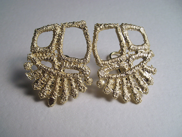 Spitze in Silber/goldplattiert abgegossen, mit Garnstruktur, als Clip mit Stecker zum besseren Sitz am Ohr, 27x29mm