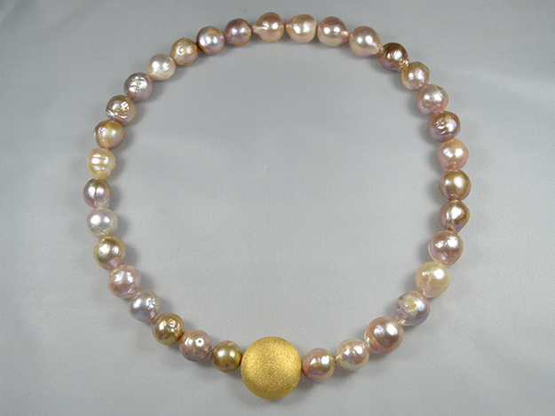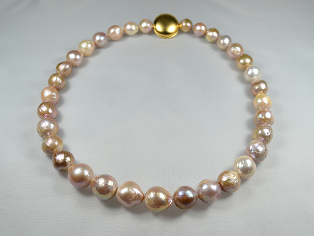 Süßwasserzuchtperlen in Aussehen wie Kasumiga Ura Perlen, 10- 15mm lang, mit Scheibenmagnetschließe in Silber, feingoldplattiert.