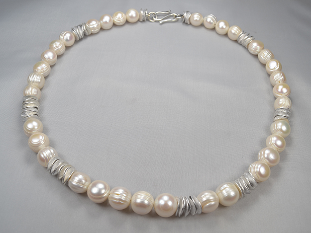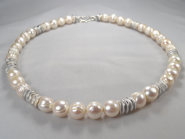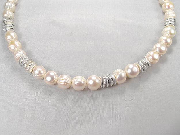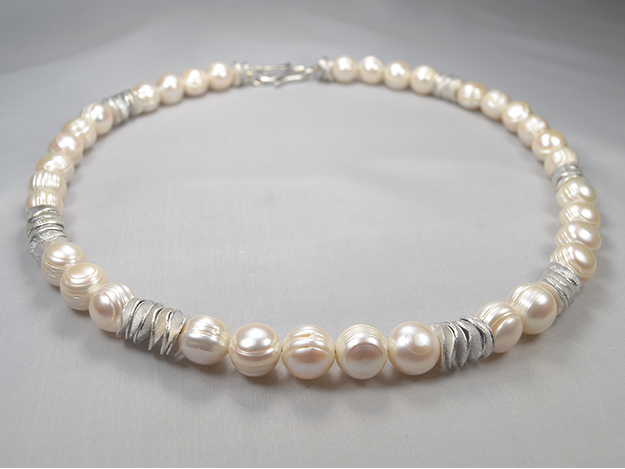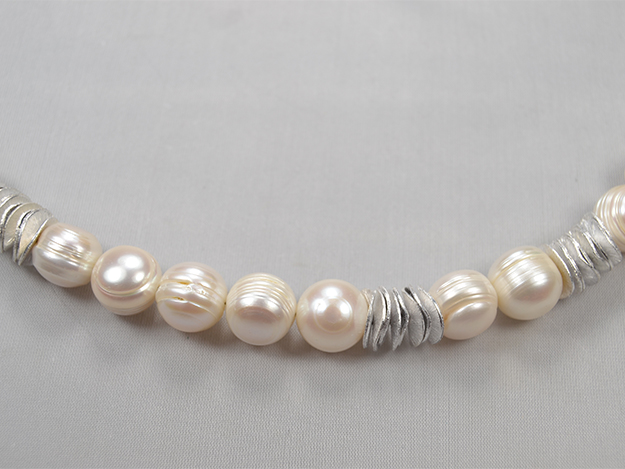 Große Süßwasserzuchtperlen mit Rillen, dazwischen gebogene Silberplättchen und Silberschließe.