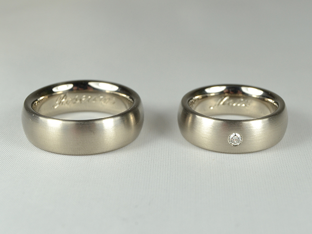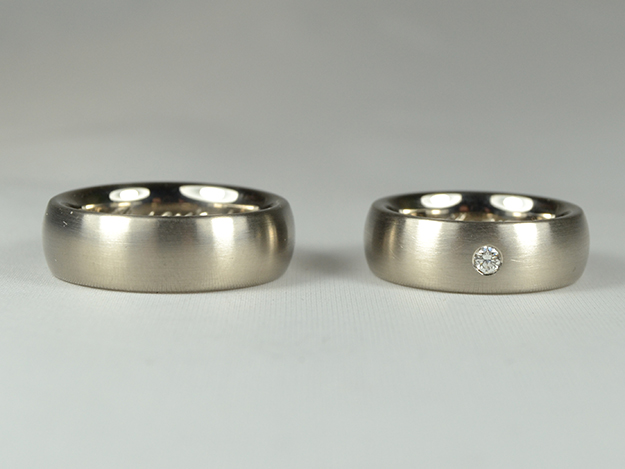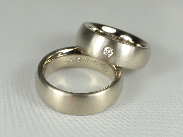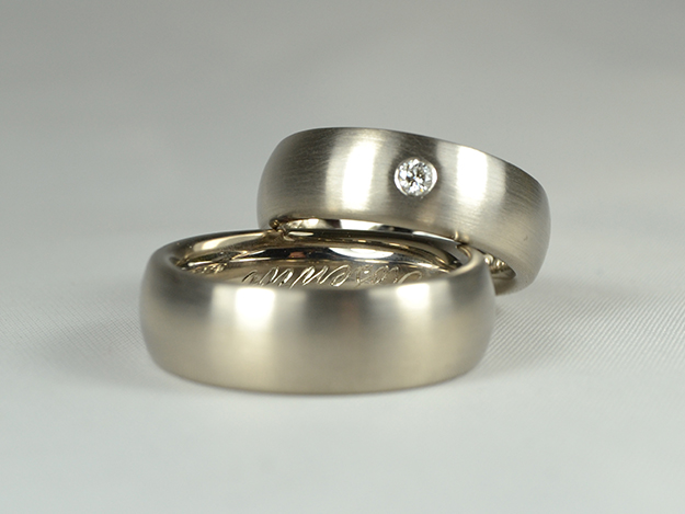Trauringpaar in 585/000 Weißgold mit gebürsteter Oberflächengestaltung.