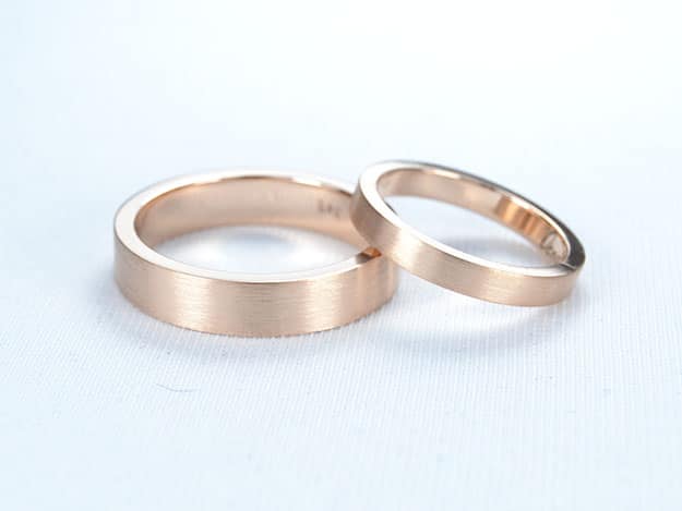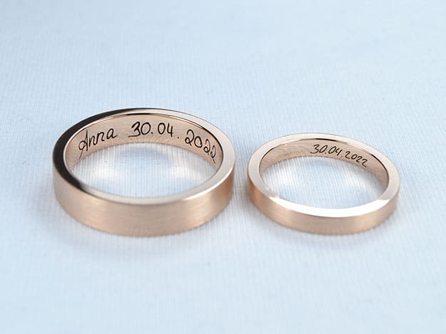 Diese Ringe sind in einem kräftigen Rotgold gestaltet und mit einer Faksimile-Gravur versehen.