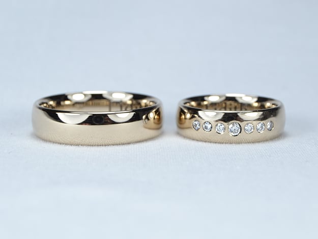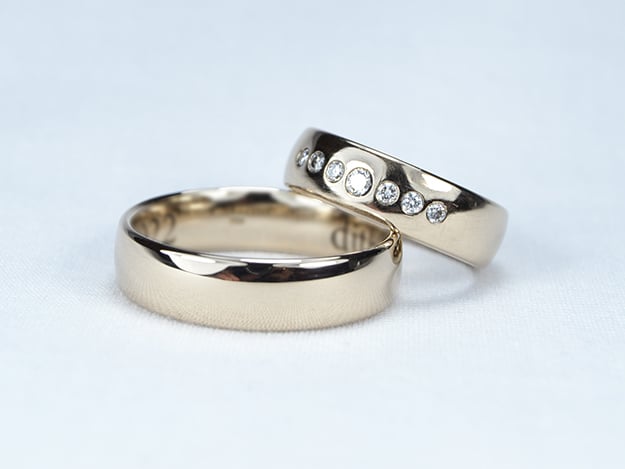 Trauringe in 750/000 champagnerfarbenem Weißgold, ein Goldton zwischen Gelb- und Weißgold. Der Damenring ist mit 7 Brillanten besetzt.