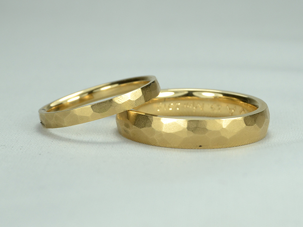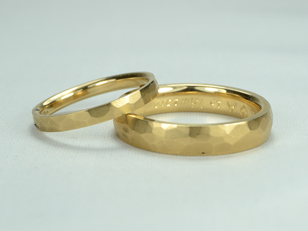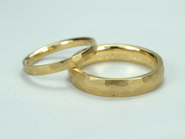 Trauringpaar aus 750/000 Gelbgold mit Hammerschlag als Oberflächengestaltung.