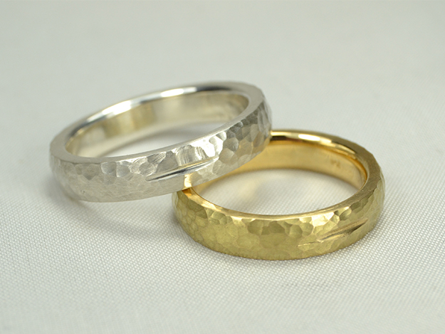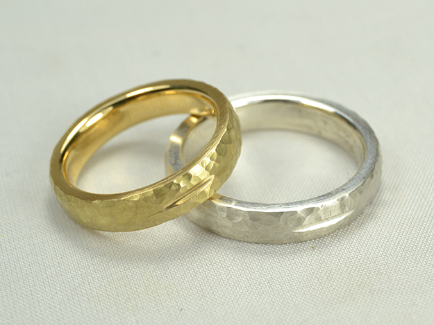 Trauringpaar, je einer in 925/000 Silber und 750/000 Gelbgold mit Kugelhammerschlag und Einkerbung.