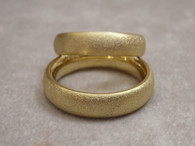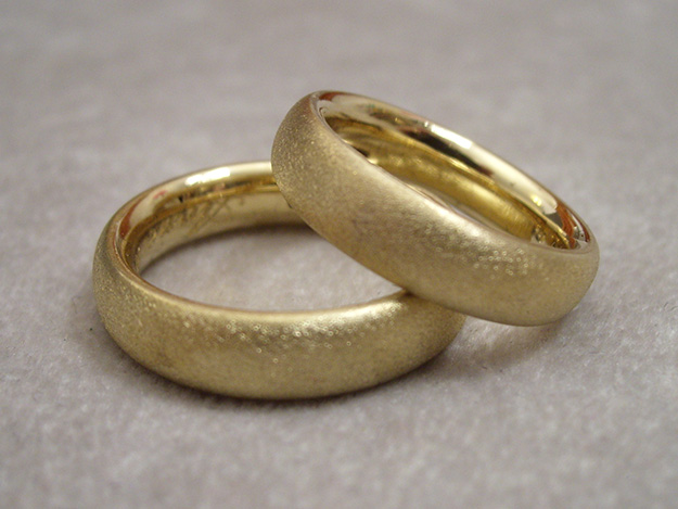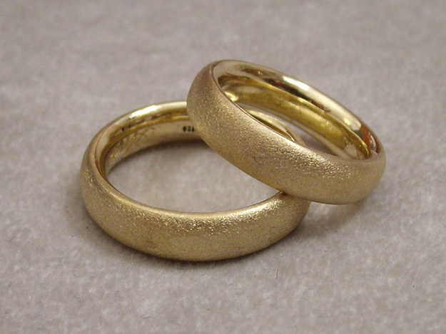 Trauringe in 750/000 Gelbgold, bombiert mit mattierter Oberfläche.