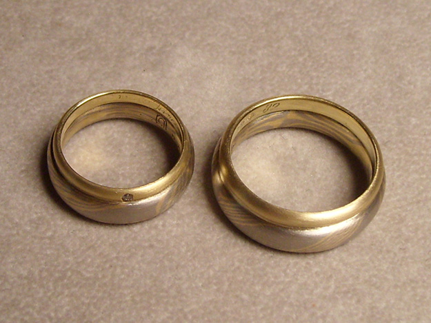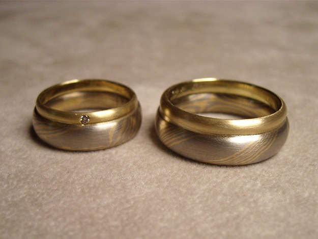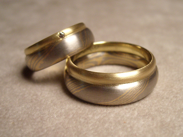 Bestehende Gelbgoldringe erweitert mit Mokume Gane Ringe in 750/000 Gelbgold und 500/000 Palladium.