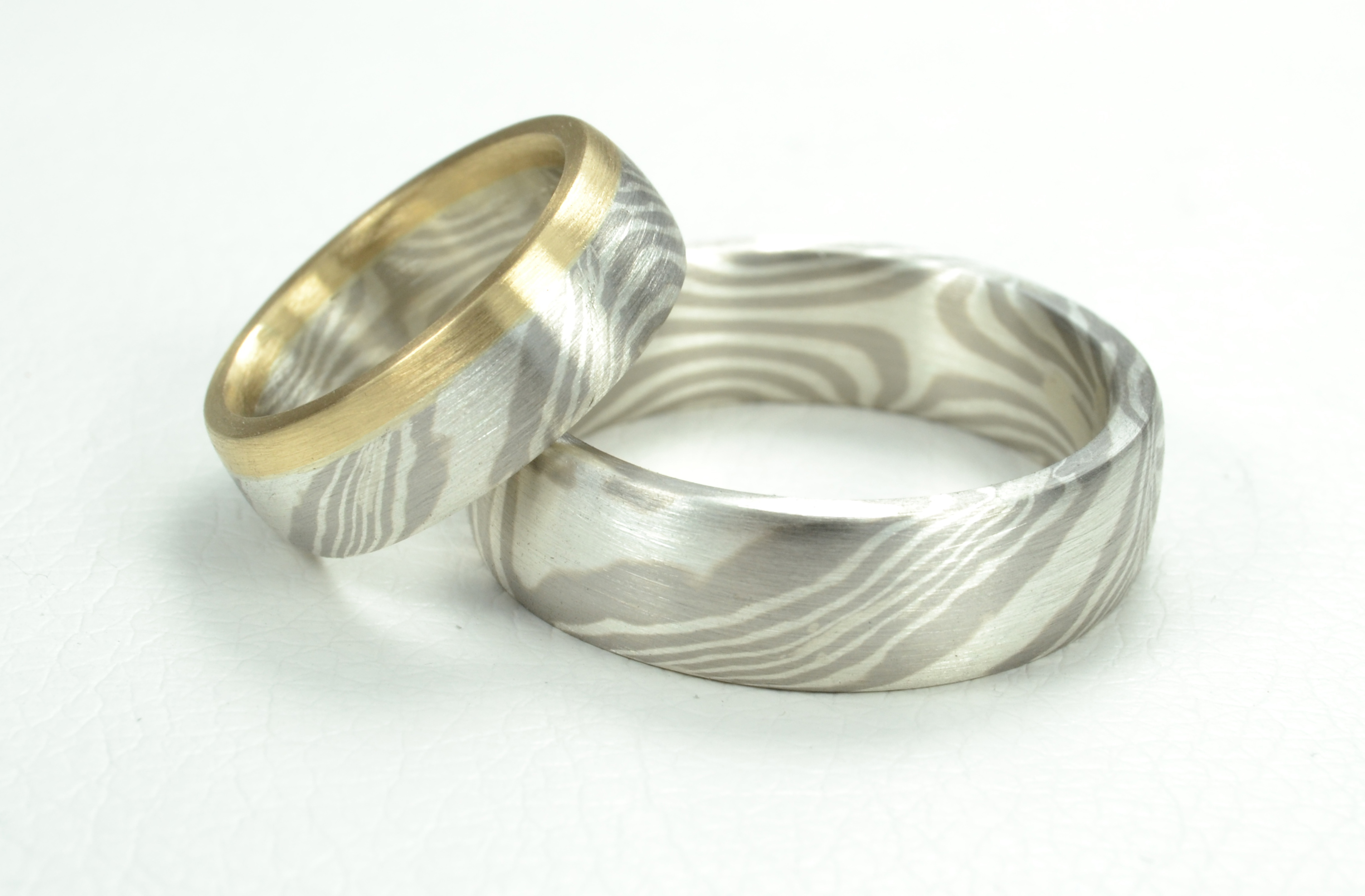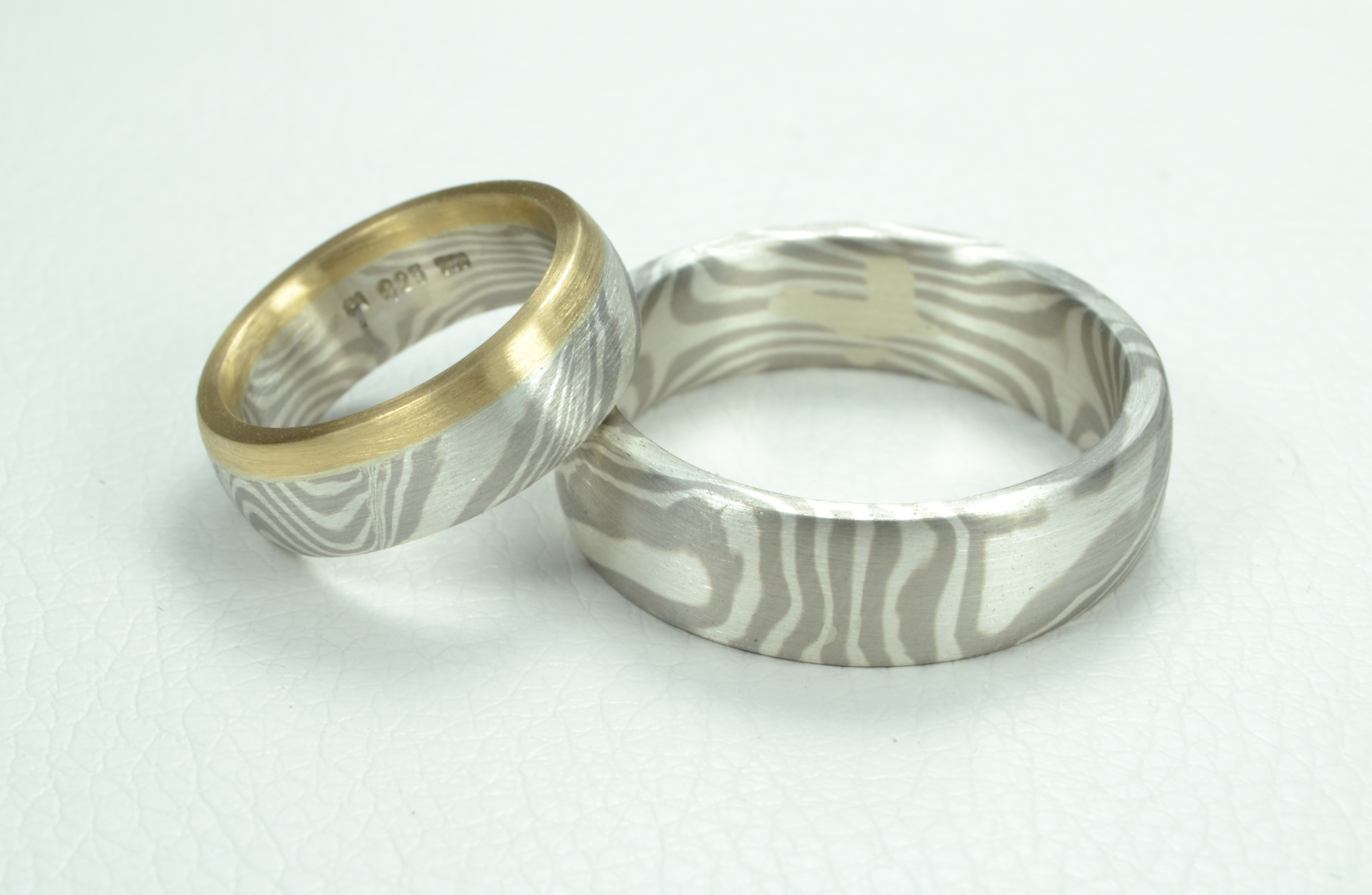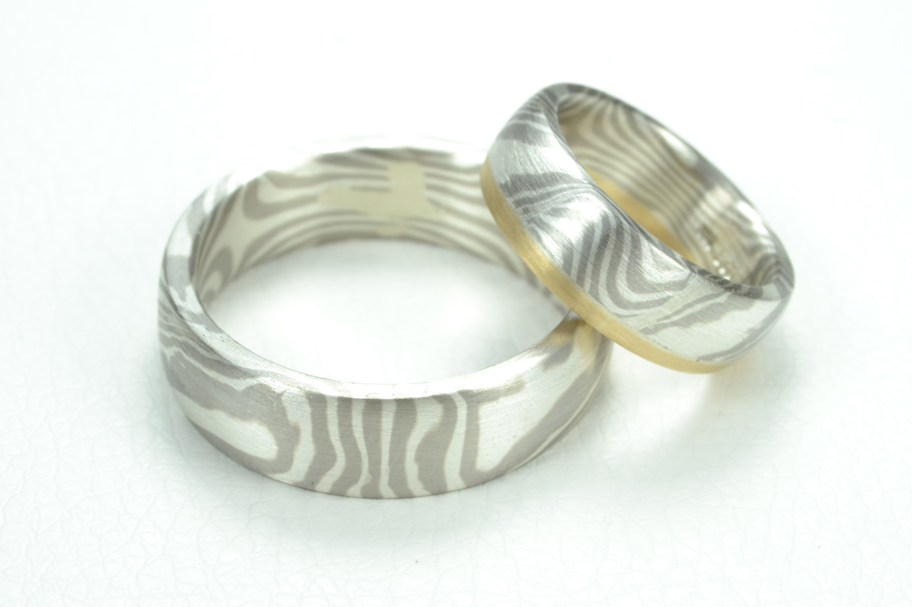 Mokume Gane, Palladium (500/000), Silber (935/000), je einer mit und einer ohne 750/000 Gelbgoldstreifen.