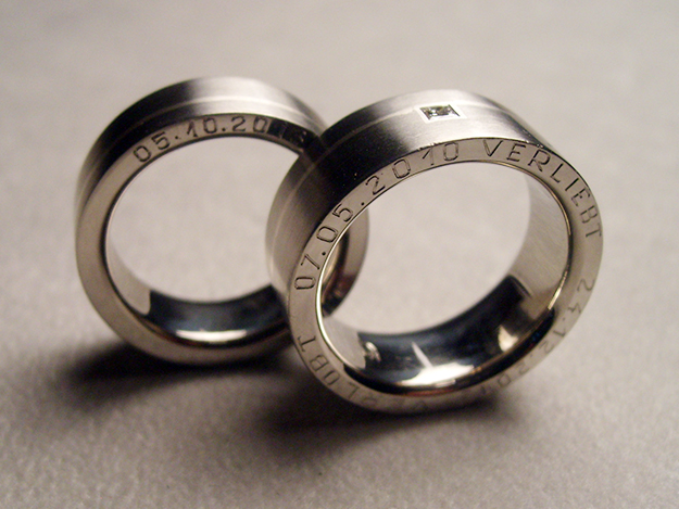 Breite Trauringe in 500/000 Palladium mit Silbereinlage und Diamant im Princessschliff, Seitlich eingravierte Daten.