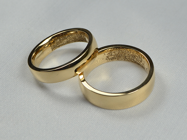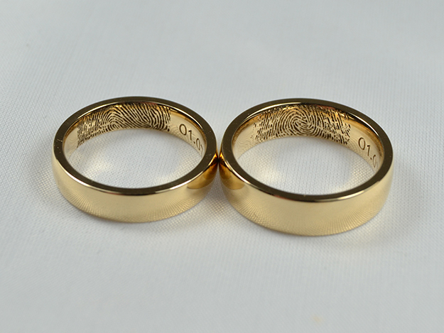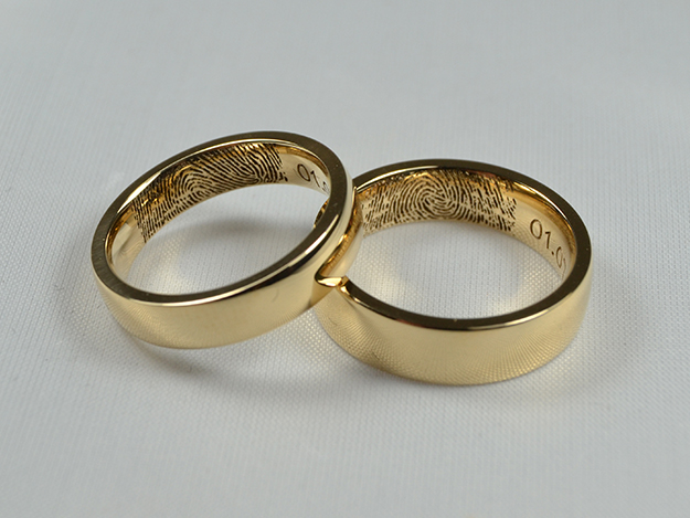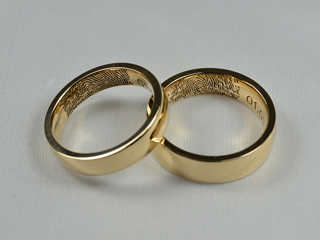 Trauringe in 750/000 Gelbgold mit einer Gravur des Partner*in-Fingerabdrucks.