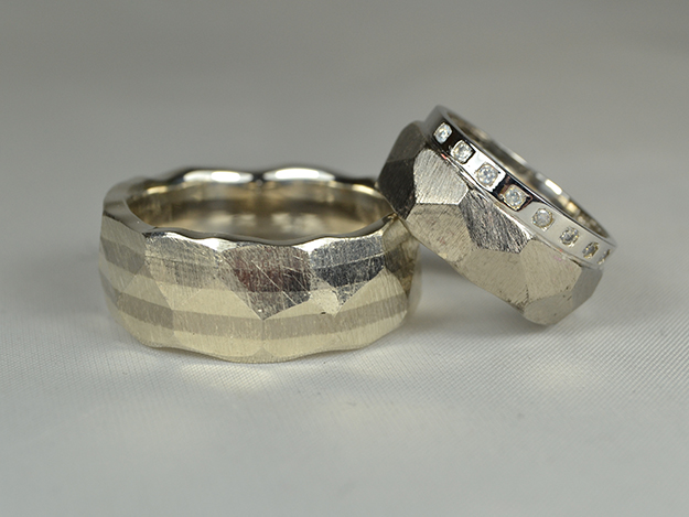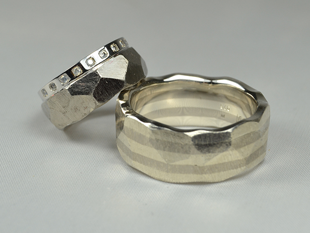 Der Damenring ist eine Weiterführung des brillantbesetzten Verlobungsrings in 585/000 Weißgold mit einem facettierten 500/000 Palladiumring, der Herrenring besteht aus 5 zusammengesetzten Ringen, 3 in 925/000 Silber und 2 in 500/000 Palladium.