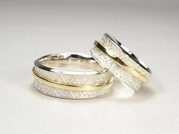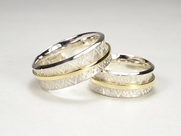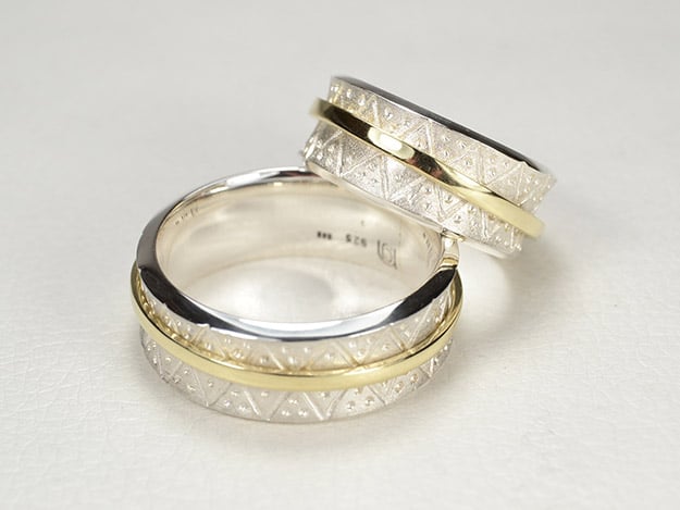 Breiter aufgetiefter Silberring mit eingefrästem Muster, frei darauf beweglich ist ein schmaler RIng in 585/000 Gelbgold.