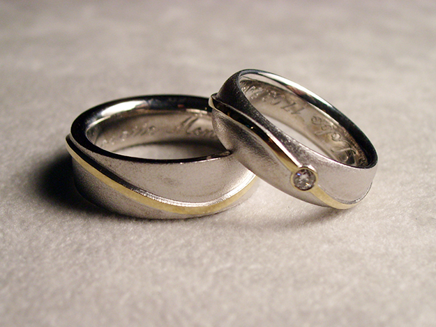 Trauringe in 585/000 Weißgold in unterschiedlicher Form und mit umlaufenden Gelbgoldbelötung in Wellenform, Damenring mit Brillant.