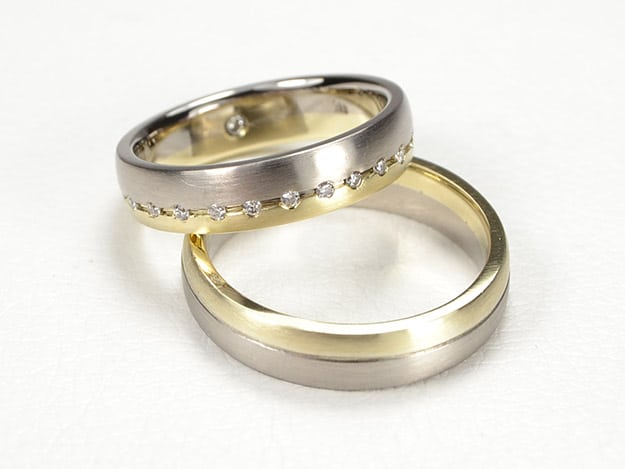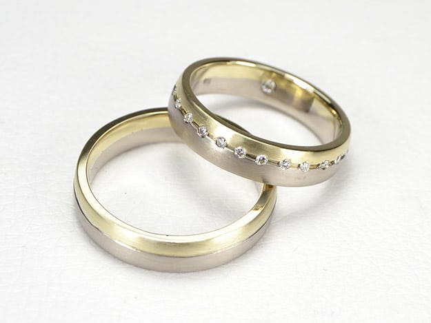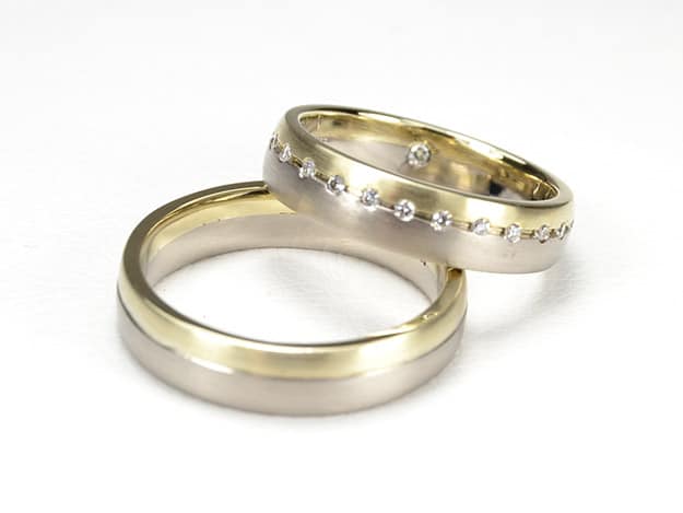 Vorhandene Gelbgold-Trauringe umgeschmiedet und mit Weißgoldringen verbreitert. 25 Brillanten auf der Trennlinie des Damenrings stehen für 25 gemeinsame Jahre.