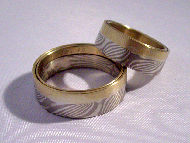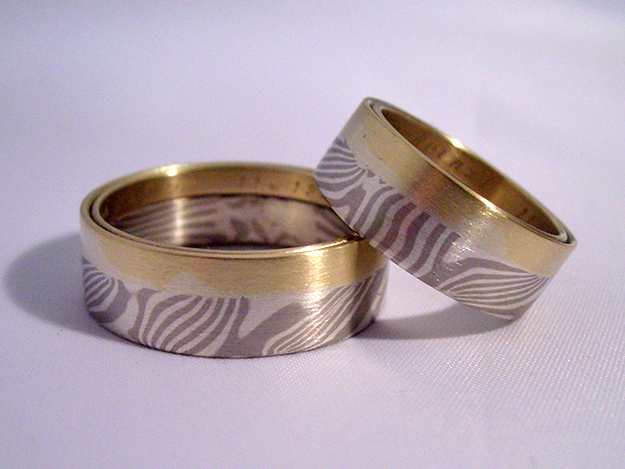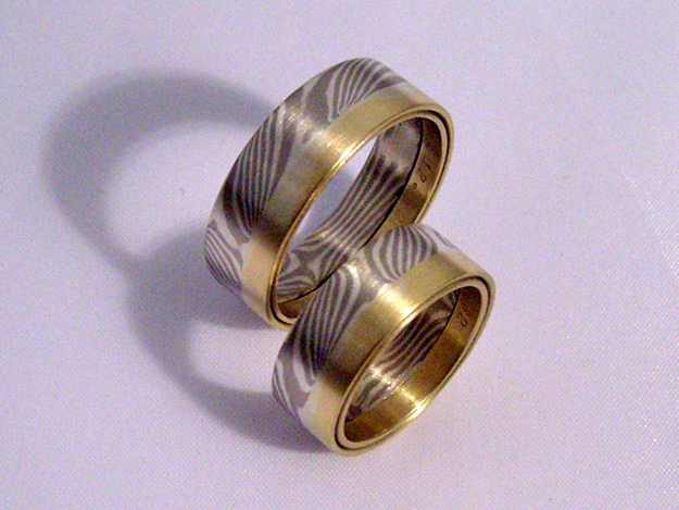 Bestehende Trauringe in 333/000 Gelbgold ummantelt mit einem 585/000 Gelbgoldring, Ringe in Mokume Gane Technik angesetzt, 500/000 Palladium und 935/000 Silber.