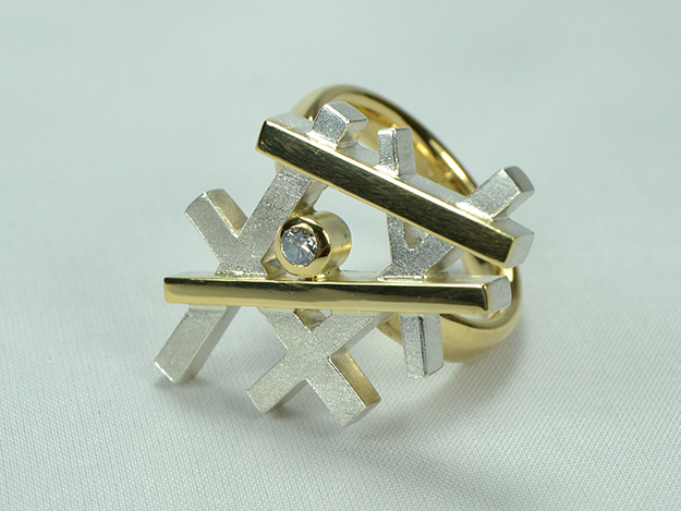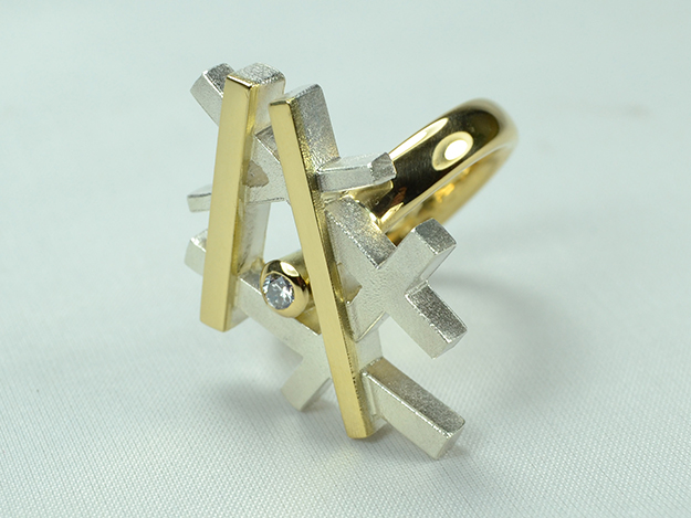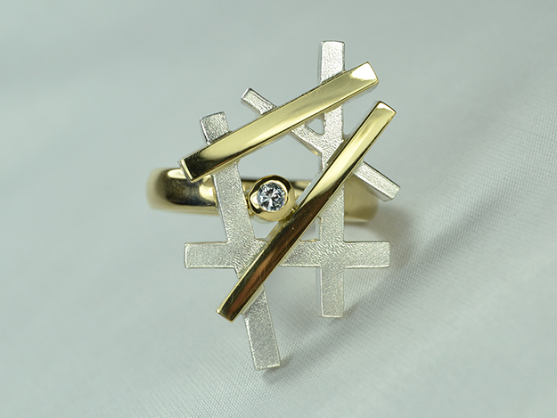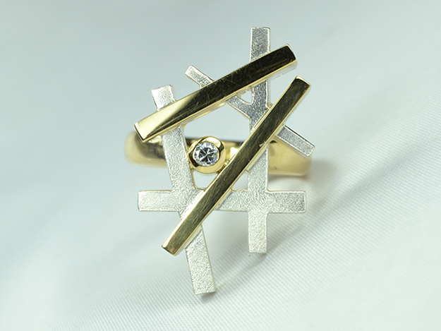 Aufsatz auf Trauring in Stäbchenform. Rhodiniertes Silber, 750/000 Gelbgold, Brillant in Zargenfassung.