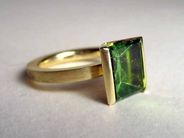 Gelbgoldring mit aufgesetztem Winkel als Fassung für einen Turmalin im Spiegelschliff.