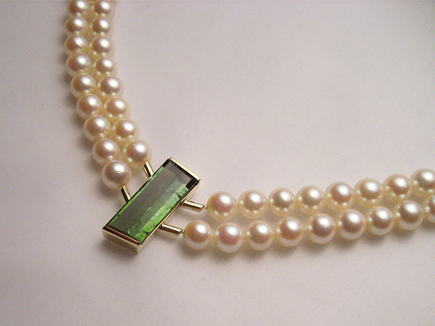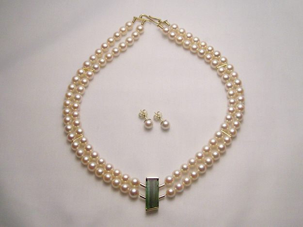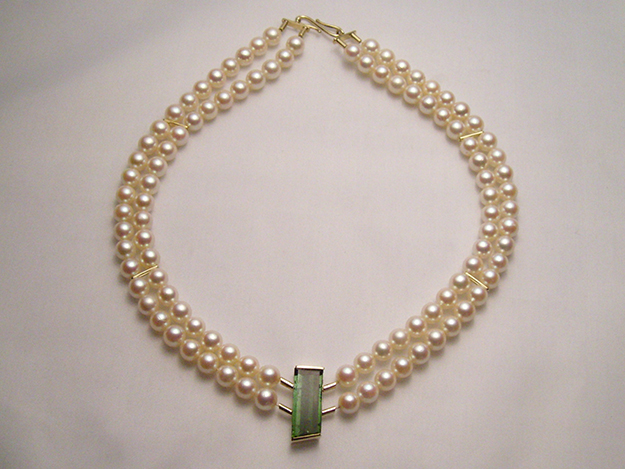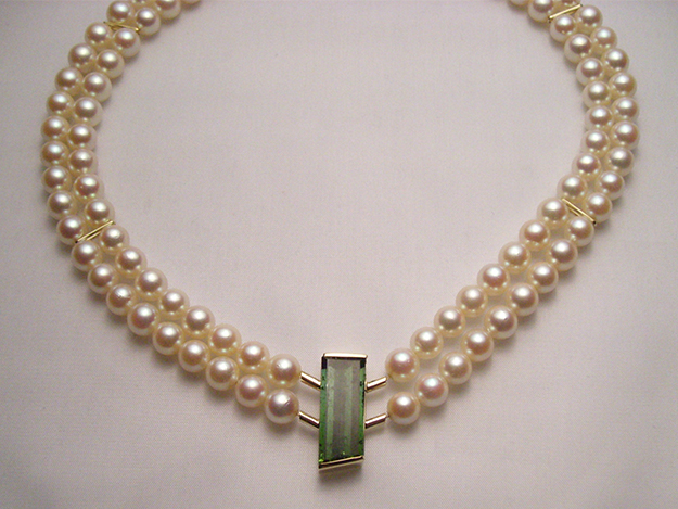 Doppelreihige Akoyazuchtperlenkette mit eingearbeitetem Anhänger in 585/000 Gelbgold für grünen Turmalin im Phantasieschliff. Schließe in 585/000 Gelbgold.