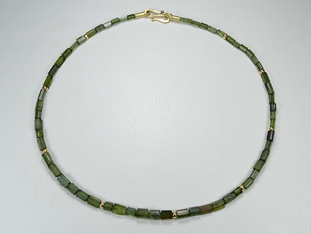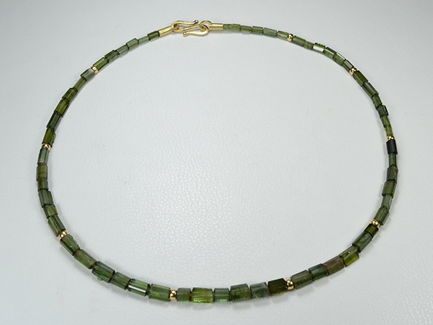 Grüne Turmalinkristalle mit Zwischenteilen und Schließe in 750/000 Gelbgold.