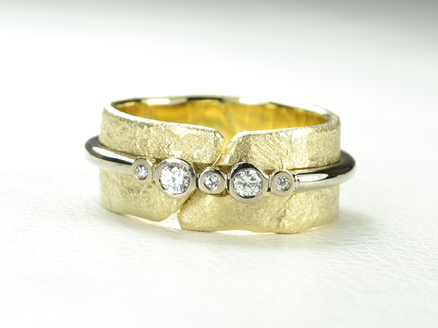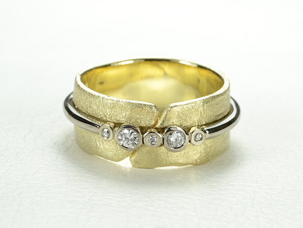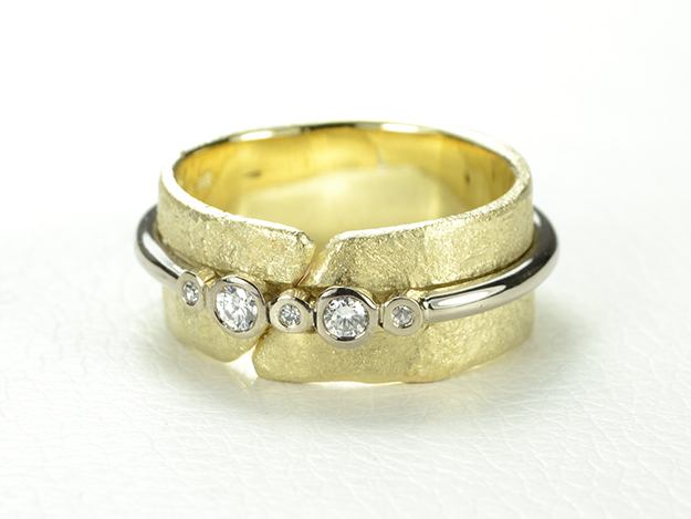 Zweifarbiger Ring in überschmolzenem Gelbgold und glattem Weißgoldring mit Brillantenbesatz aus Bestand.