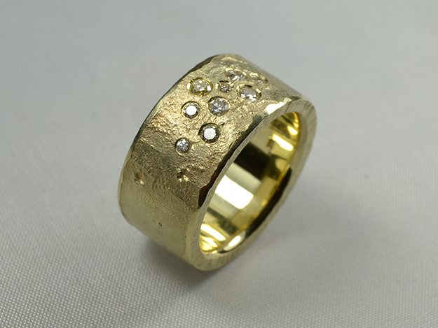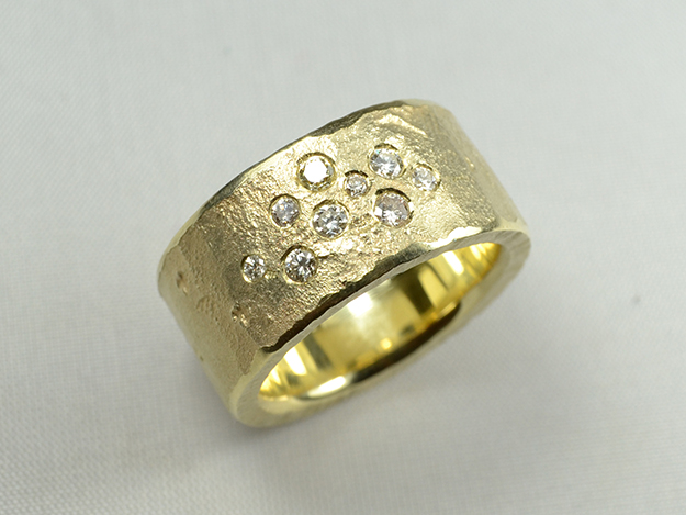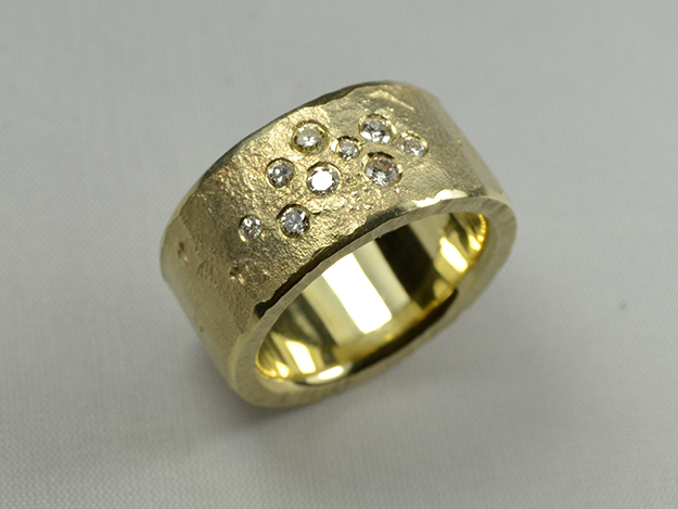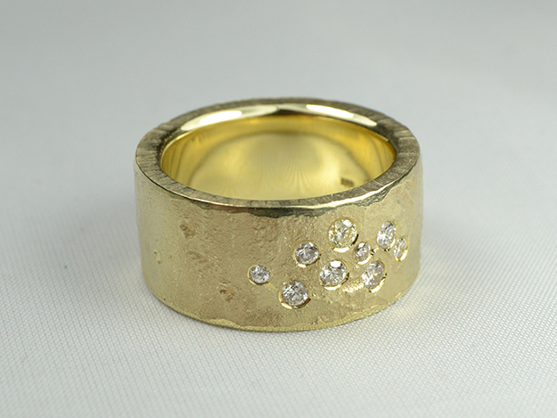 Breiter, voluminöser, überschmolzener Ring mit Kundenbrillanten.