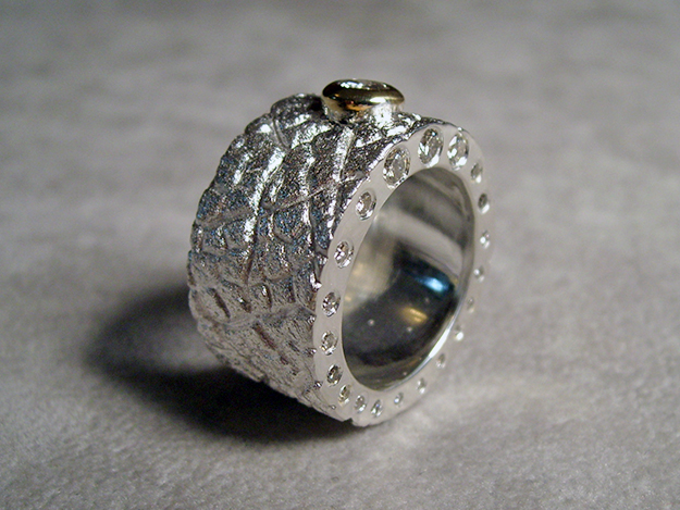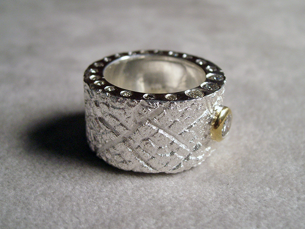 Silberring mit Oberflächenstruktur eines Vergiss-mein-nicht-Blattes, seitlich und in der aufgesetzten Fassung sind Kundenbrillanten gefasst.